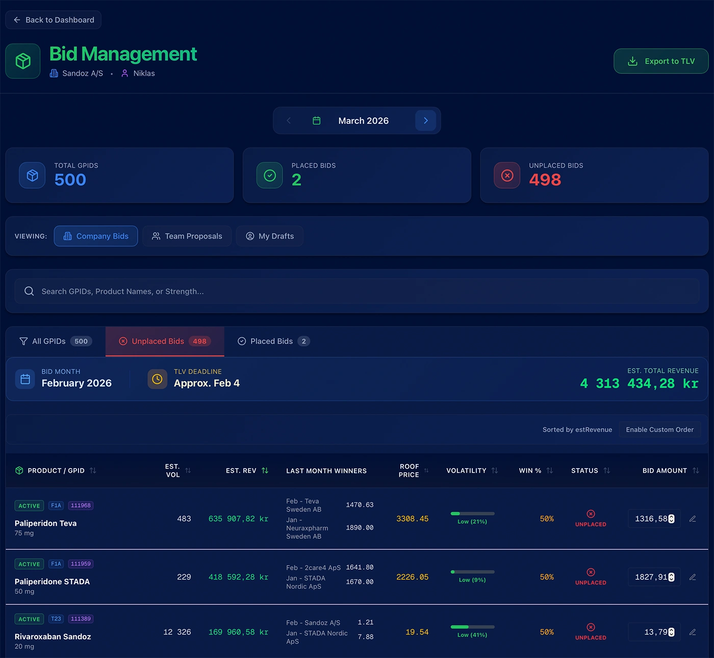 We help pharma companies decide what to bid in Nordic tenders in Sweden, Denmark and Finland. The platform predicts likely competitor moves and suggests a bid that balances win probability and margin. We work with one customer per substitution group ensuring our recommendations are confidential, compliant and actionable.